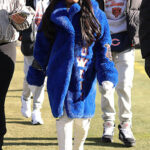 Then came the fashion moment that sealed her place in Chicago sports lore. Biles stepped out in a custom cobalt blue fur coat that was impossible to ignore. The coat wasn’t just stylish—it was a statement. Adorned with photos of Owens, his name, and his jersey number, 36, it blurred the line between fashion and storytelling. It told a story of pride, partnership, and public support without a single word spoken.